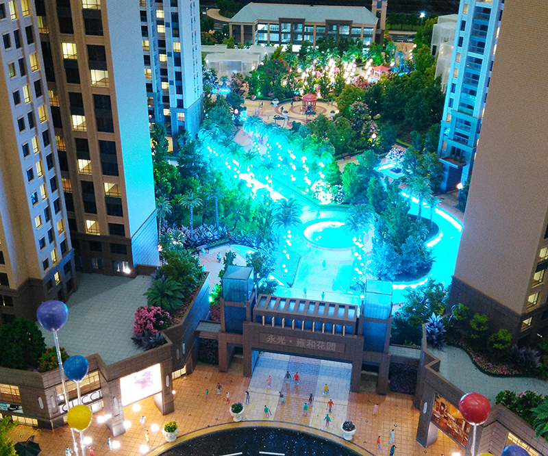 模型采用ABS等材料經(jīng)過CAD畫圖手工拼接、上色等制作工藝完成、并在模型內(nèi)部輔助LED燈光達到客戶展示要求